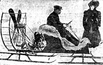 | У аэросаней мотор помещается обычно в задней части корпуса. Он вращает авиационный пропеллер, который ввинчивается в воздух подобно штопору в пробку и двигает сани |