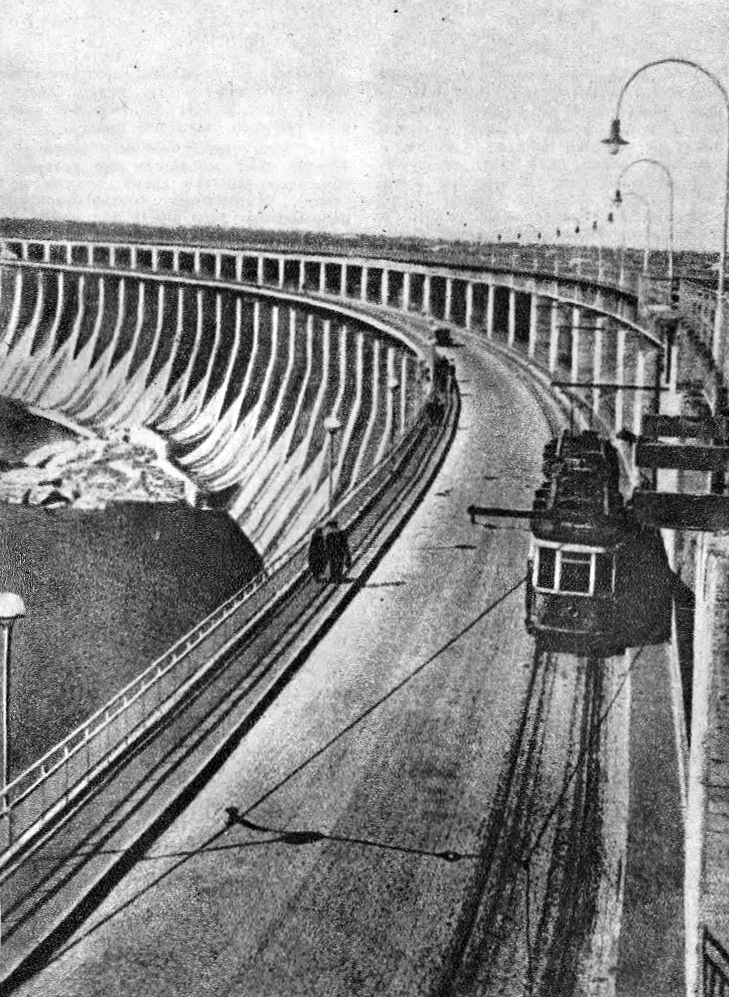 Плотина Днепровской гидроэлектростанции имеет вид гигантской дуги, описанной радиусом в 600 метров. Она производит огромное впечатление своими гигантскими размерами и весьма красивой формой.